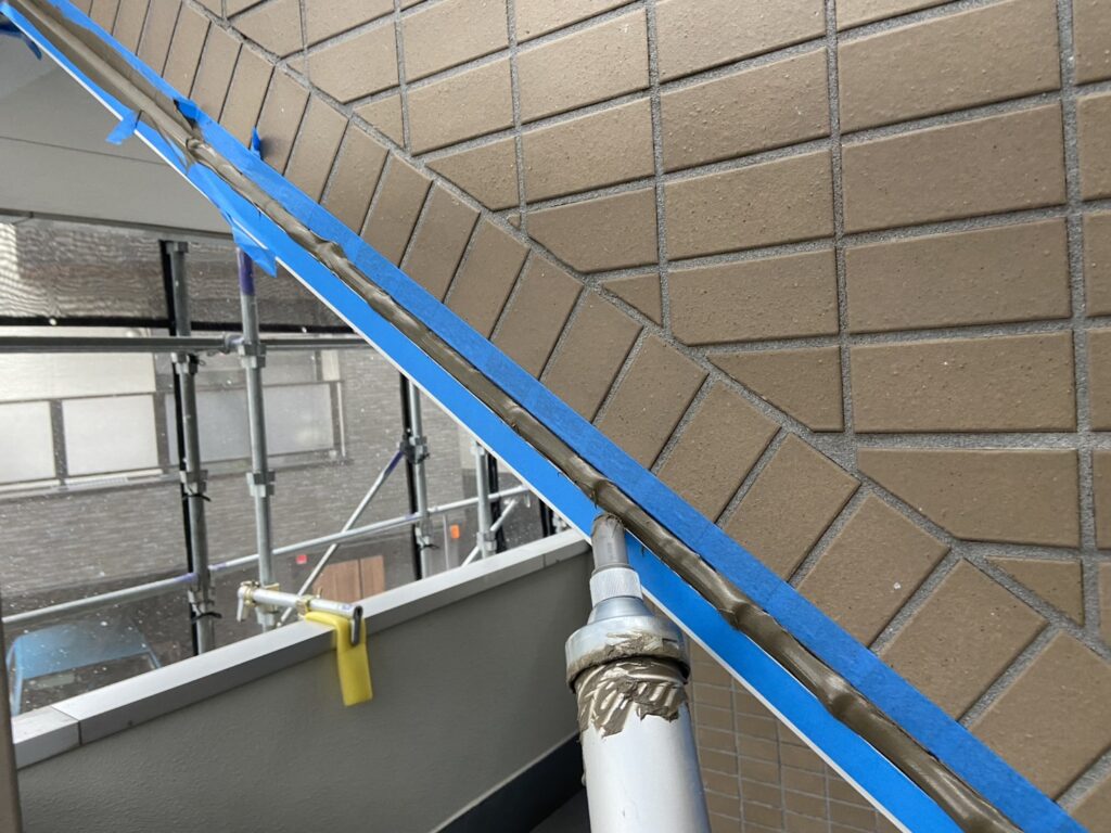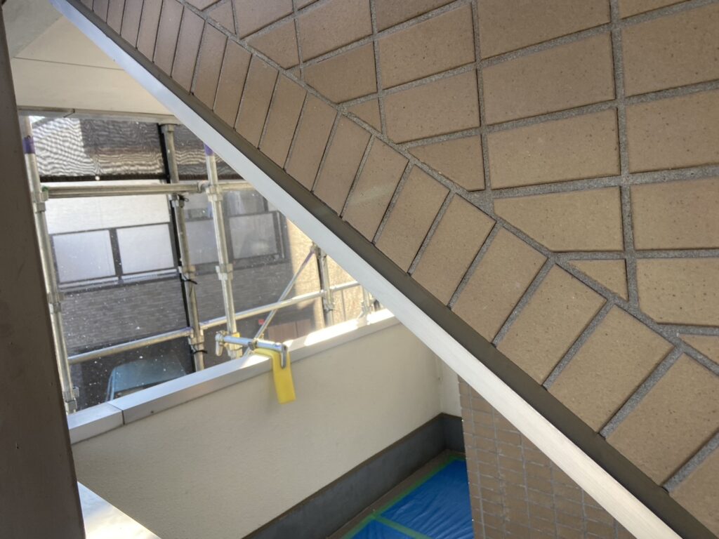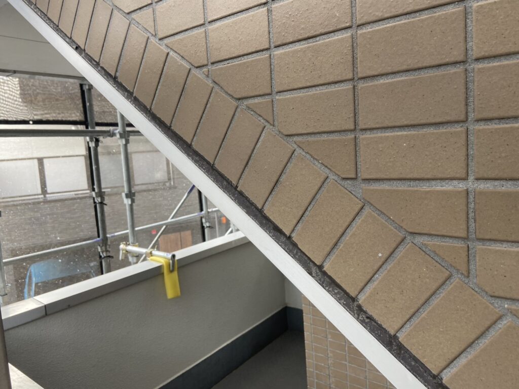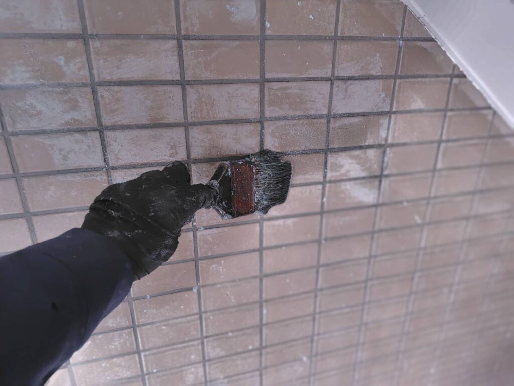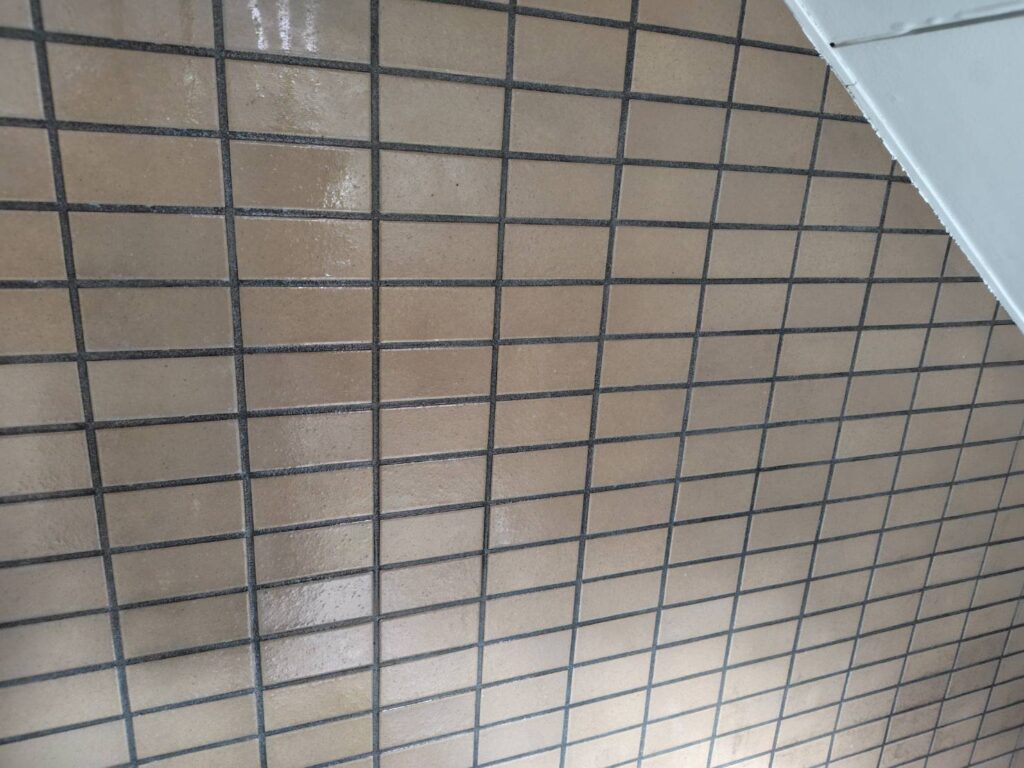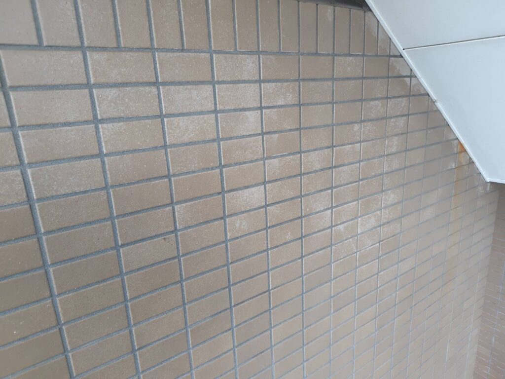 この作業は想定以上に手間がかかる難しい工程でしたが、「白く濁った外観の改善」「劣化塗膜の除去によるタイルの健全化」「今後の保護処置に適した下地づくり」につながる重要な工事でした。